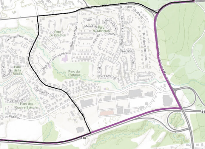 Légende : On propose de transférer de Hull-Aylmer à Pontiac la zone située entre les boulevards des Grives et Saint-Raymond, au sud du chemin Pink et au nord des Allumettières. Crédit photo : Commission de délimitation des circonscriptions électorales fédérales pour le Québec