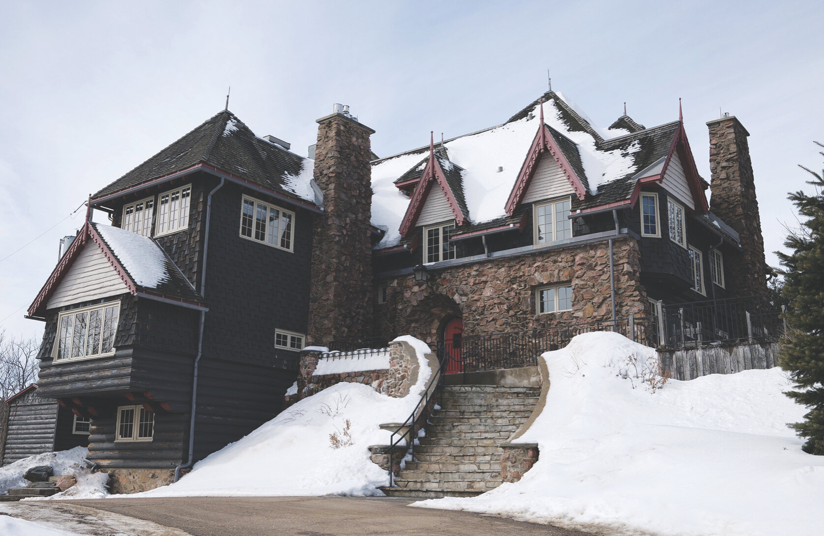 Designed by Ottawa architect Werner Noffke in the Queen Anne Revival style, the two-and-a-half storey structure features a steeply pitched cedar-shingled roof, wood siding milled to resemble logs, and a foundation, terraces and chimney of local granite. The NCC acquired the property in 1964, at a point the organization later described as the building being on the verge of ruin. It was designated a federal heritage building in 1984.