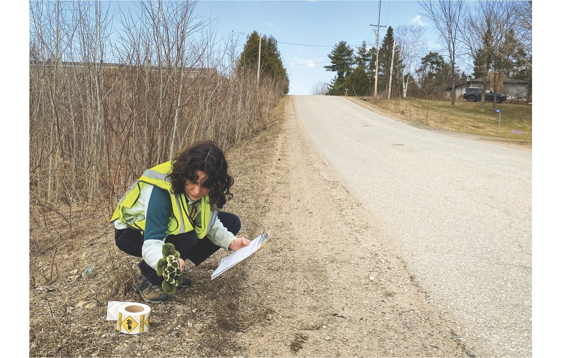 Photo caption: Residents within Outaouais can participate in the Conseil Régional de l’Environnement et du Développement Durable de l’Outaouais’ turtle inventory by tracking turtles along roadways.